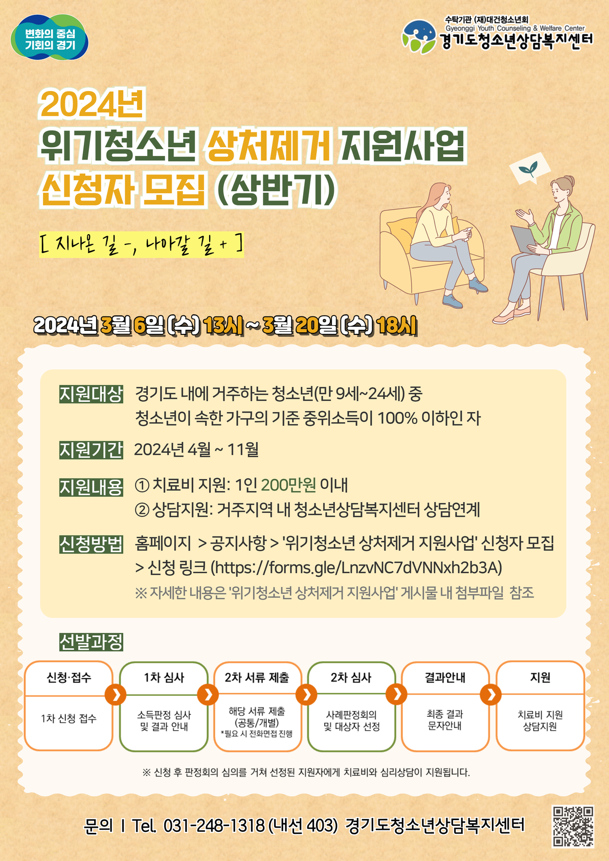 자세한 내용은 첨부파일 <2024년 위기청소년 상처제거 지원사업 안내>를 참고하시기 바랍니다.
