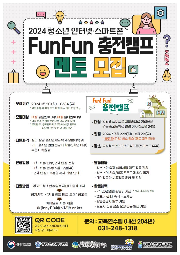 본 센터에서는 올해 인터넷․스마트폰 과의존으로 심리적 어려움을 겪고 있는 중·고학생 연령의 여자 청소년 24명을 대상으로 11박 12일 기숙형 치유캠프(전문상담, 대안활동, 체험활동 등)를 운영할 예정입니다. 본 프로그램과 함께할 열정적이고 재능있는 멘토를 모집하고자 하오니 많은 지원바랍니다.