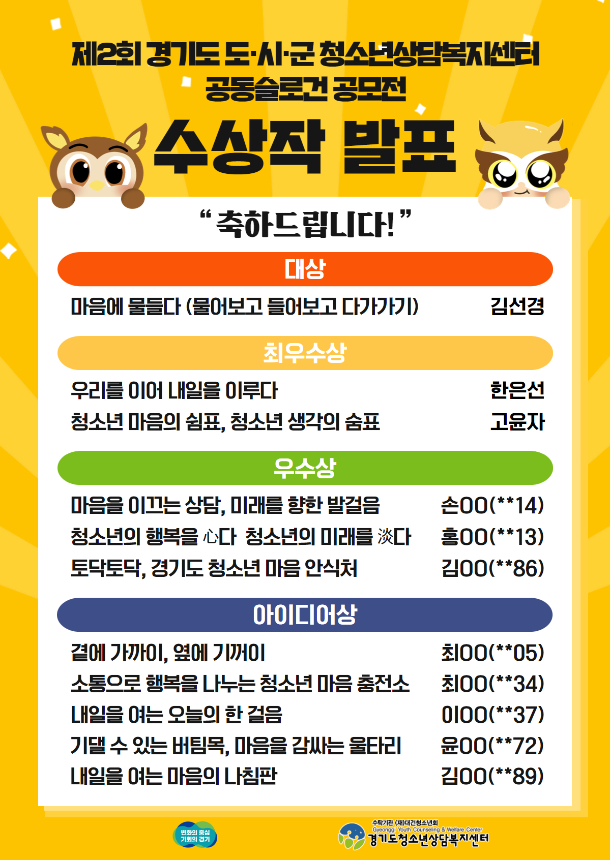 「공동슬로건 공모전」은 시민이 직접 청소년상담복지센터의 슬로건을 제안하는 자리로 2022년 처음 시행되었으며,