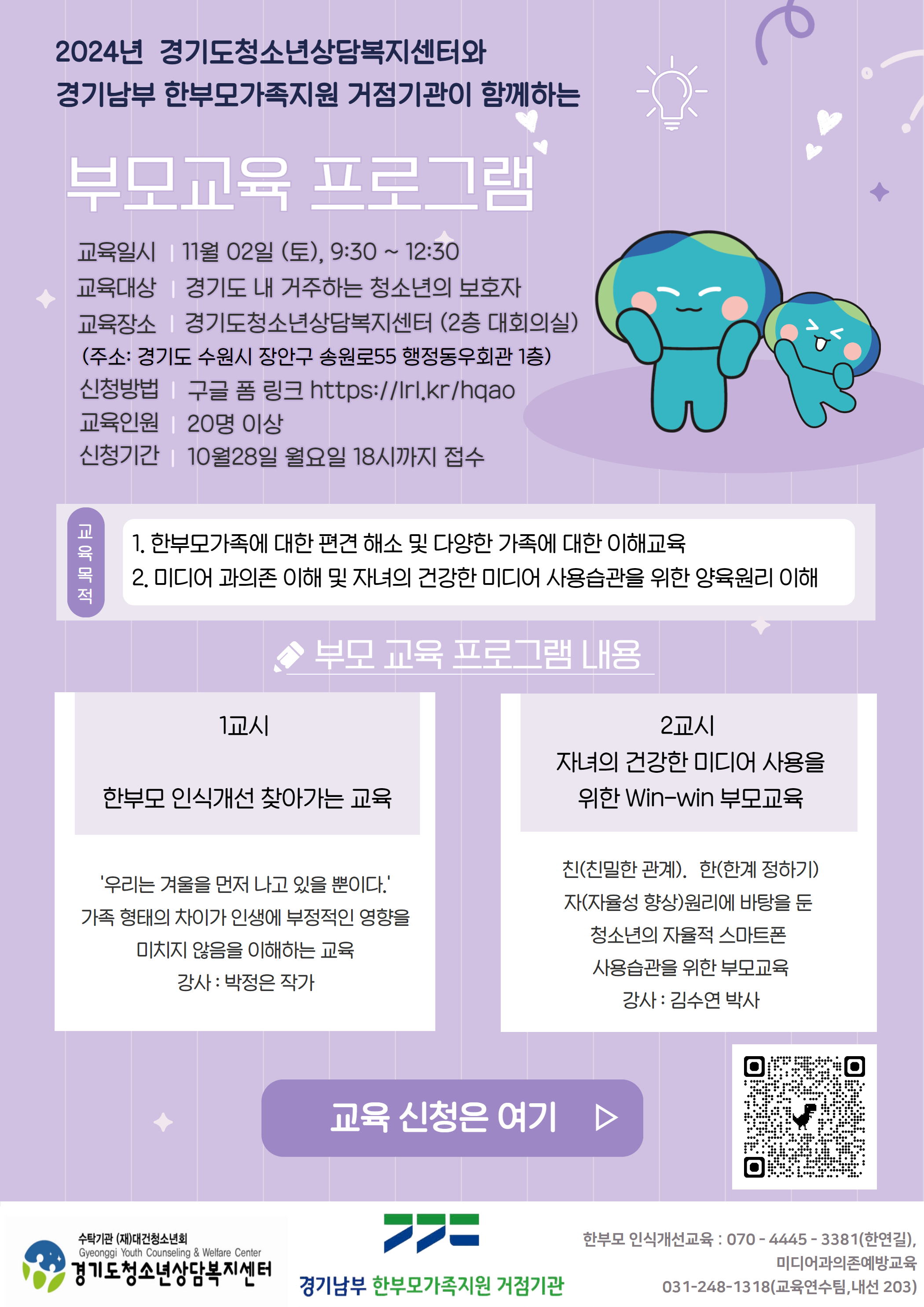 한부모 인식개선과 자녀의 건강한 미디어 사용을 위한 친·한·자 부모교육을 준비했습니다.