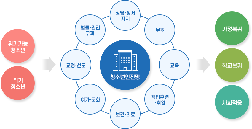 청소년안전망은 청소년복지지원법 제9조에 근거하여 지자체별로 구성되며, 지역주민, 기관, 단체 등 지역 내 활용가능한 자원의 연계를 통해 지역사회청소년통합지원체계를 구축하여 위기상황에 처한 청소년들을 발견하고 상담·보호·자립 등 맞춤형 서비스를 제공합니다.